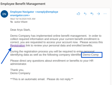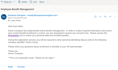 1. HR will send you a welcome/registration email to register in Employee Navigator. The email will be sent from noreply@employeenavigator.com. Note: Since the email is system-generated, if you do not see it be sure to check your spam/junk folder.