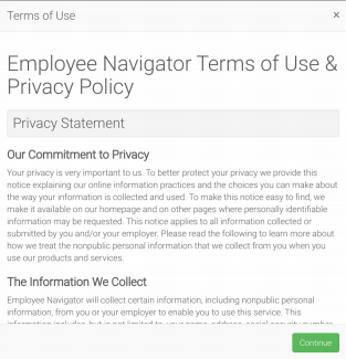 6. Once you have registered successfully in the system, you’ll be prompted to the Welcome page. You can click Continue and begin enrolling in your benefits and/or completing any onboarding tasks.