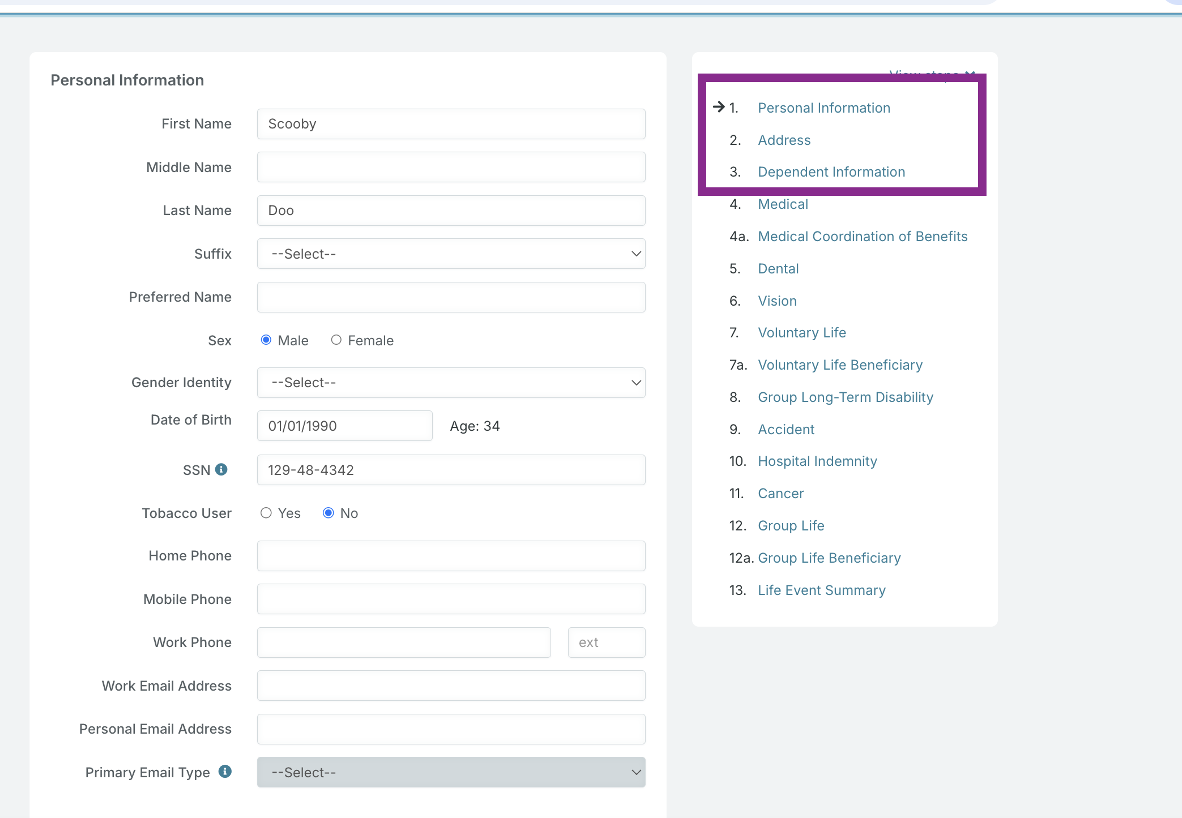 8. You will first be required to review and edit (if needed) your Personal Information (step 1), your Address (step 2), and your Dependent Information (step 3).