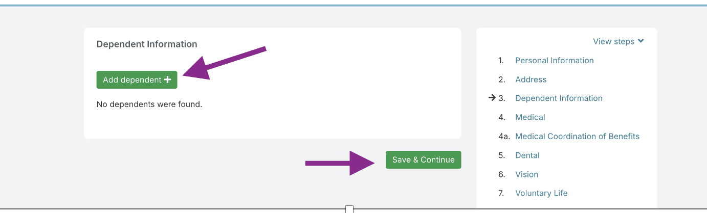 If adding dependents to your benefits, please be sure to add your dependents in the Dependents Information section.