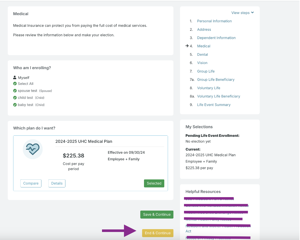 9. Once you get to the benefits section, you will follow the steps to complete your Life Event. In the example below, since I am dropping coverage on 9/30/24 due to being eligible for other coverage, I will select End & Continue. You will go through each benefit until you reach your Life Event Summary.